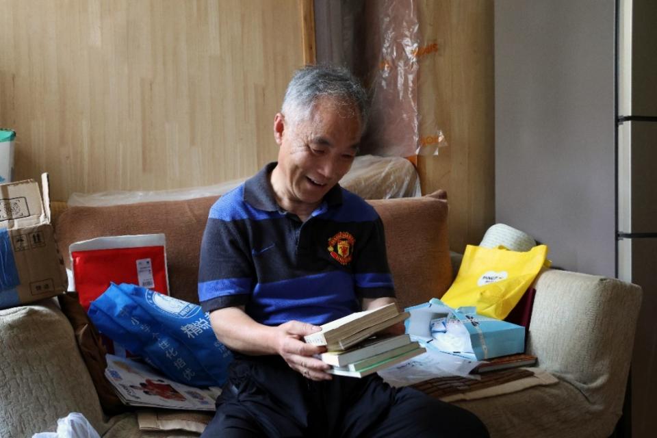 李振海将自己从家中带来的书和文具拿给朱凤涛