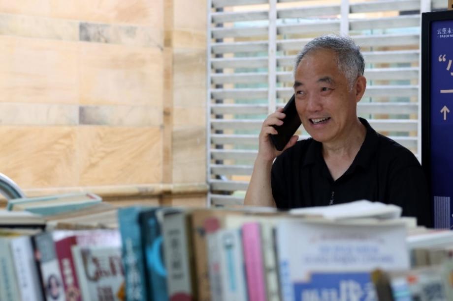 朱凤涛在松江云堡未来市艺术文创园区的新书店内看书