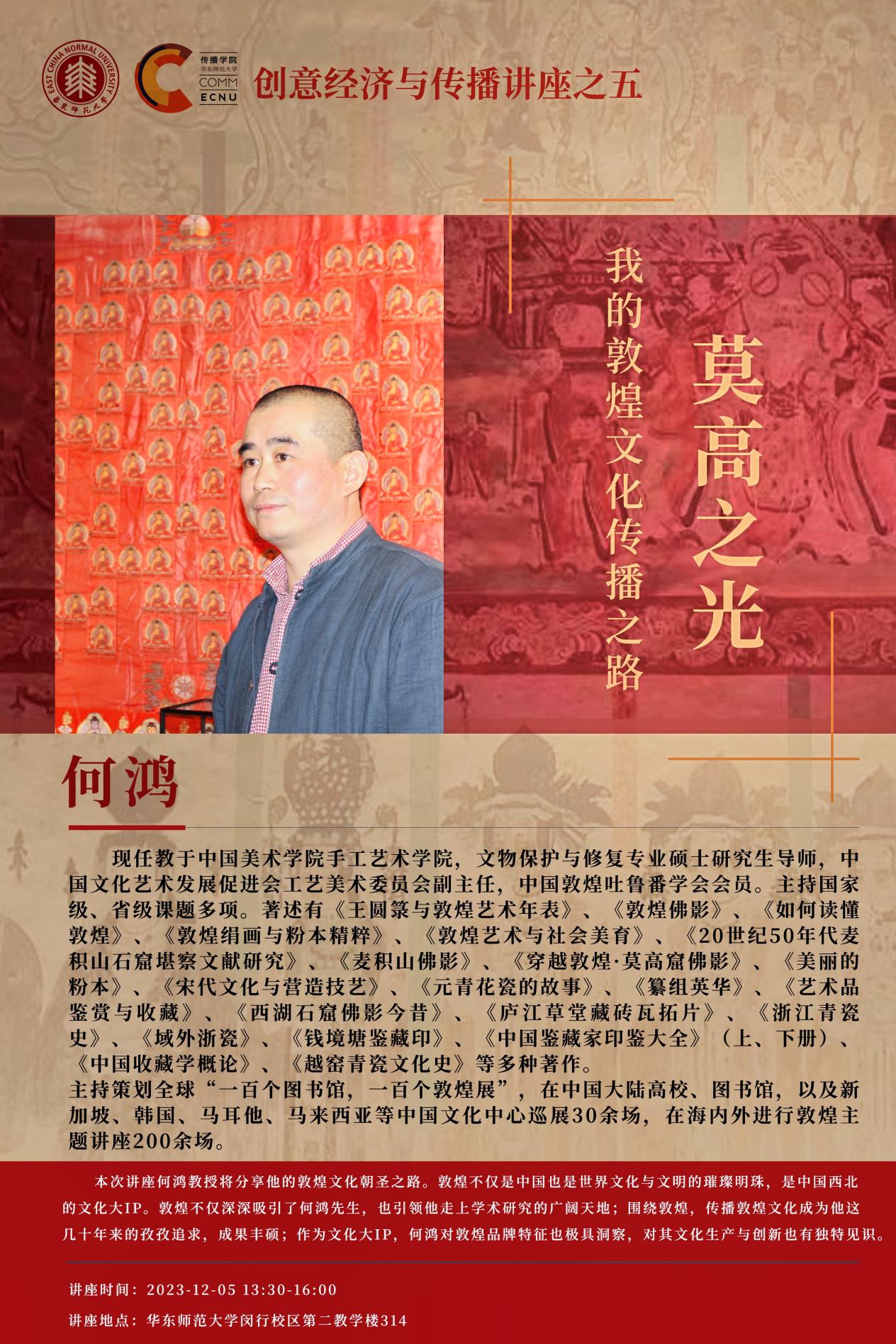 何鸿教授将分享他的敦煌文化朝圣之路。敦煌不仅是中国也是世界文化与文明的璀璨明珠,是中国西北的文化大IP。敦煌不仅深深吸引了何鸿先生,也引领他走上学术研究的广阔天地;围绕敦煌,传播敦煌文化成为他这几十年来的孜孜追求,成果丰硕;作为文化大IP,何鸿对敦煌品牌特征也极具洞察,对其文化生产与创新也有独特见识。