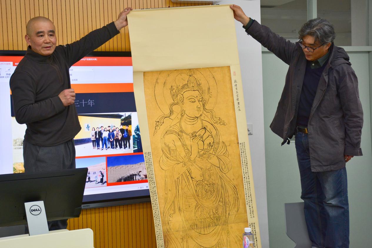 最后,何鸿展示了张大千在莫高窟生活两年零七个月留下来的画作,并从纸张材质、作画方式进行了详细介绍,为同学们提供了近距离接触珍贵画稿的机会。提问环节,何鸿针对同学们关于敦煌王道士的双面历史评价提供了自己的意见,并对该问题的复杂性作出解释。