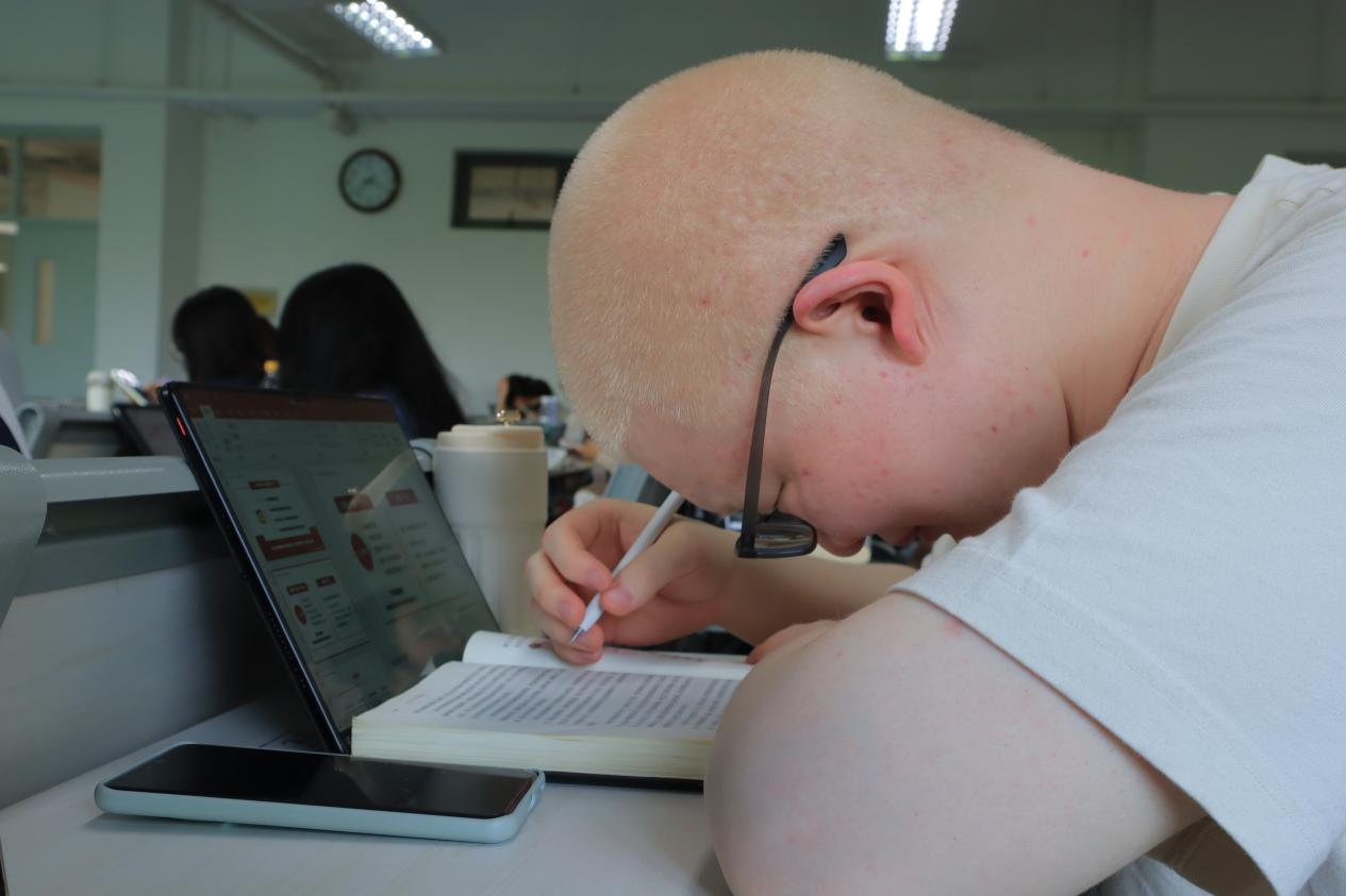 上了大学,听课对他来说又是一道难题。戴着眼镜坐在第一排也是徒劳的,挽救的办法是整节课举着手机放大黑板上的内容。