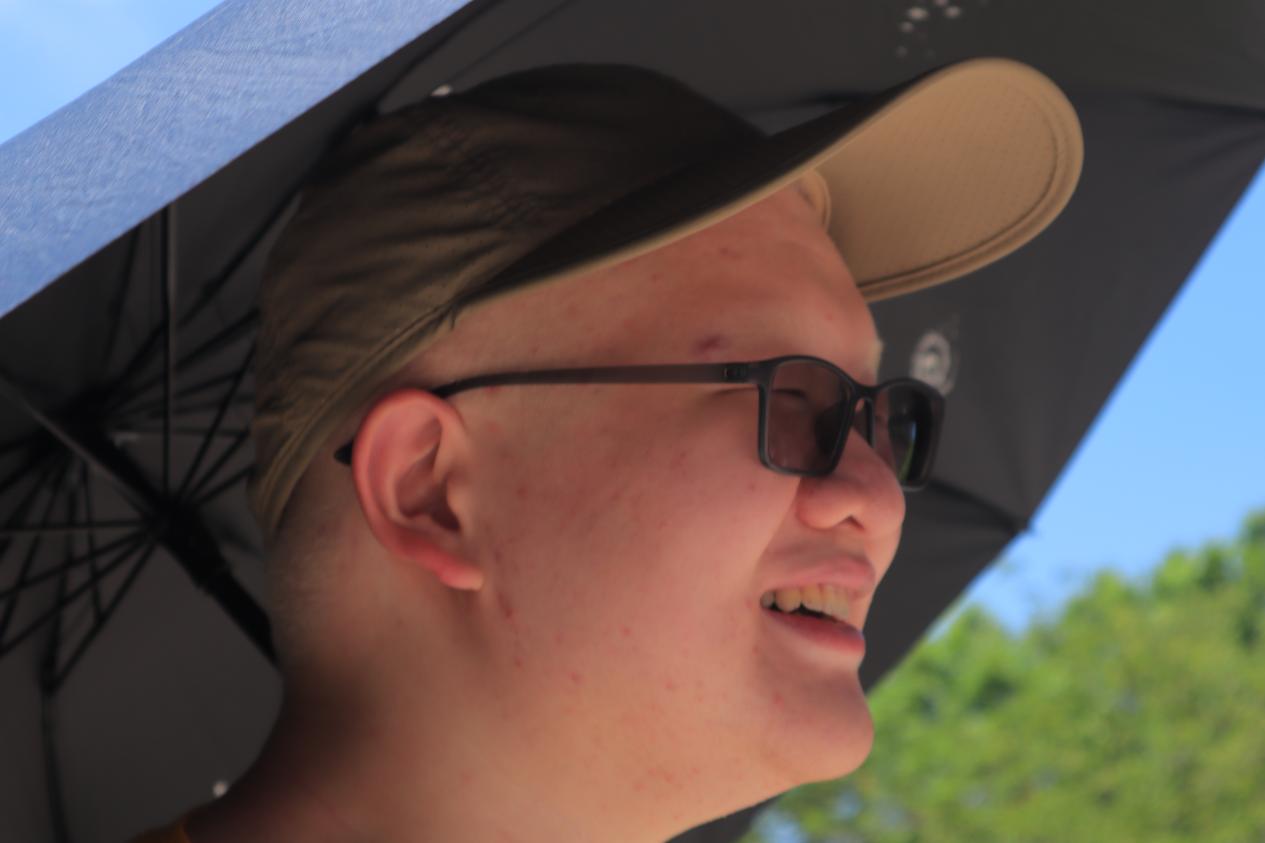 虽然有遮阳伞的保护,在艳阳天孙旭的皮肤也会因为接触紫外线而泛红