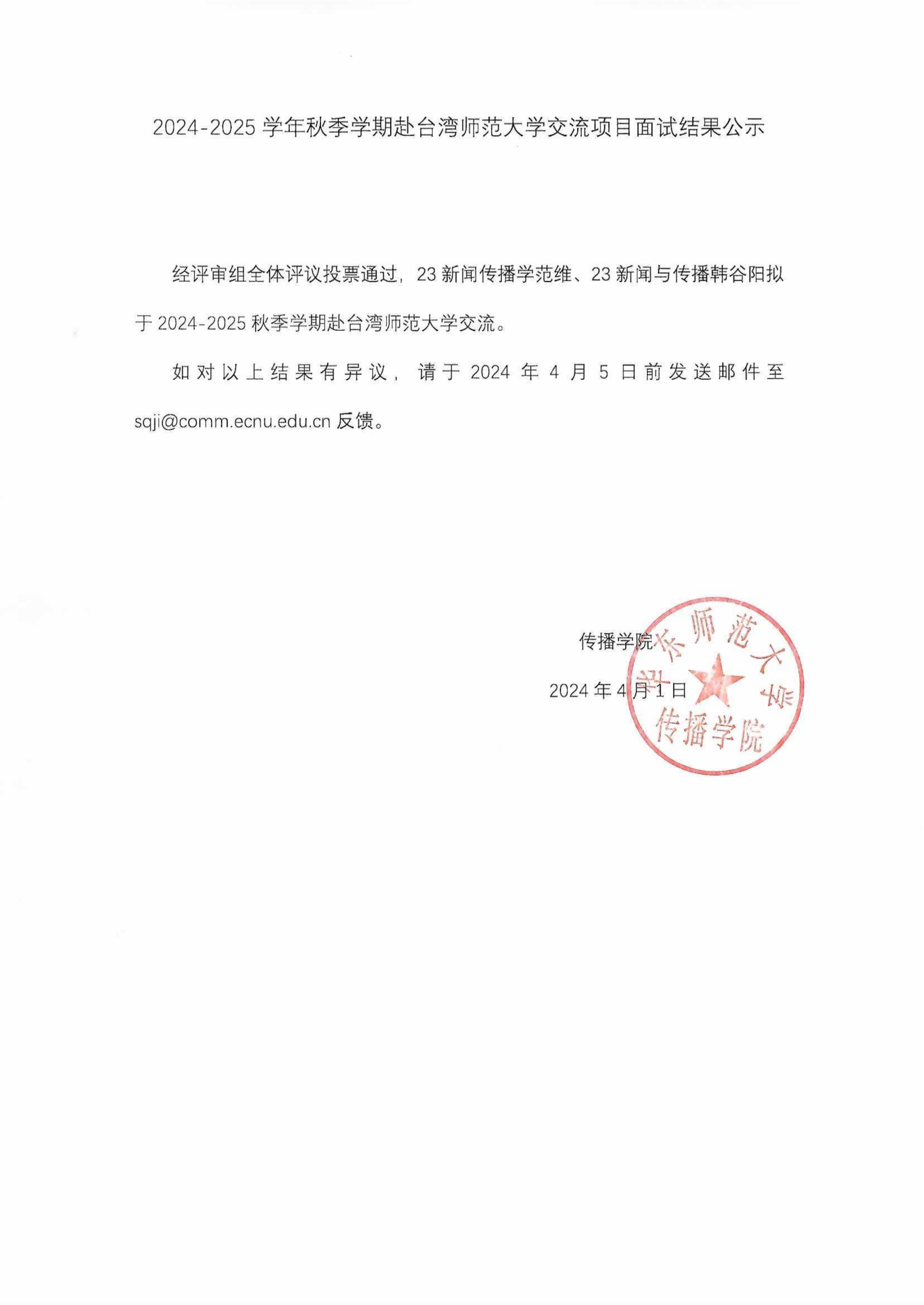 2024-2025学年赴台湾师范大学交流项目面试结果公示