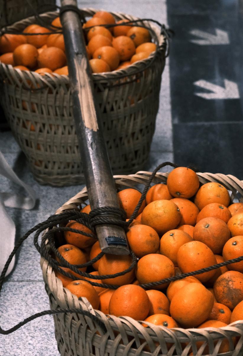 汇集了菜农与城市居民的地铁十号线,自然成为了他们进行蔬果交易的场所。正在挑选橘子的是住在江北区的王女士,作为一名家庭主妇,她每周六早上会乘坐这班地铁送小孩儿去上辅导班。王女士一边选橘子一边感慨:“每周六都有很多这些农民,你看他们背篓里啥都有,豆角、番茄、自家晒的干菜,下车前就能把菜买齐,省得绕去菜市场。”