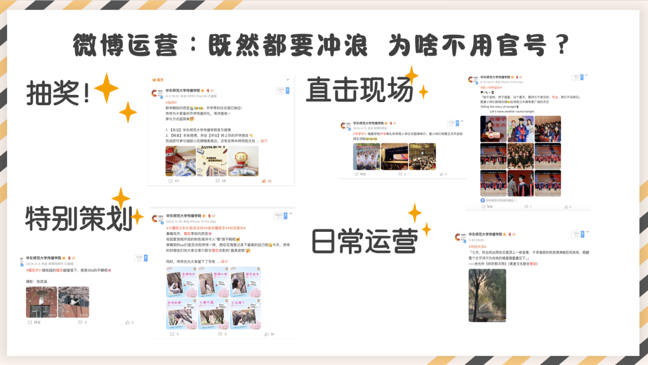 宣传中心以学院官方微博运营为主要职责,我们还会奔走在学院各类新闻现场,开展师生专访、新媒体专题策划等多样化特色专题工作。(你现在看的这份推送就是由我们组织成文的哦!)