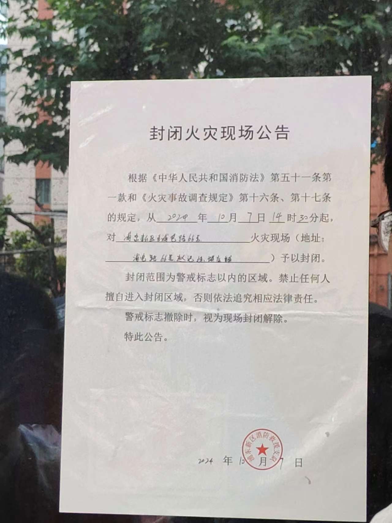 (记者拍摄的封闭火灾现场公告)