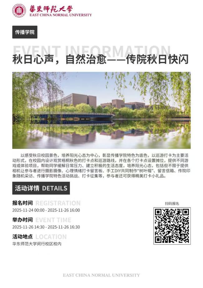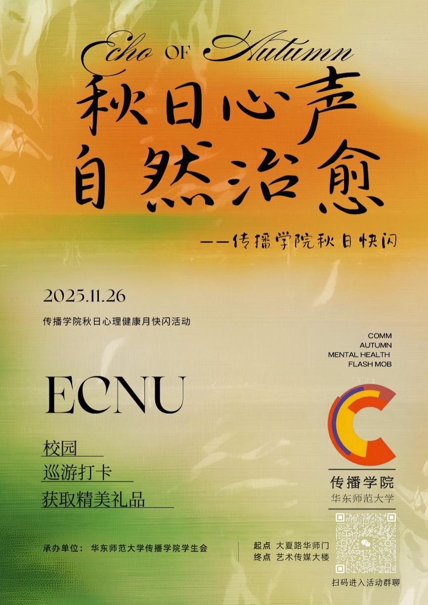 学生会“秋日心声·自然治愈”快闪活动已准备好与你相遇!让我们一起解锁校园秋日限定玩法——在趣味游戏中释放压力,在打卡点定格美好瞬间,在落叶铺就的小径上惬意漫步。在校园里捕捉秋光、放松心情,感受属于秋天的无限活力!