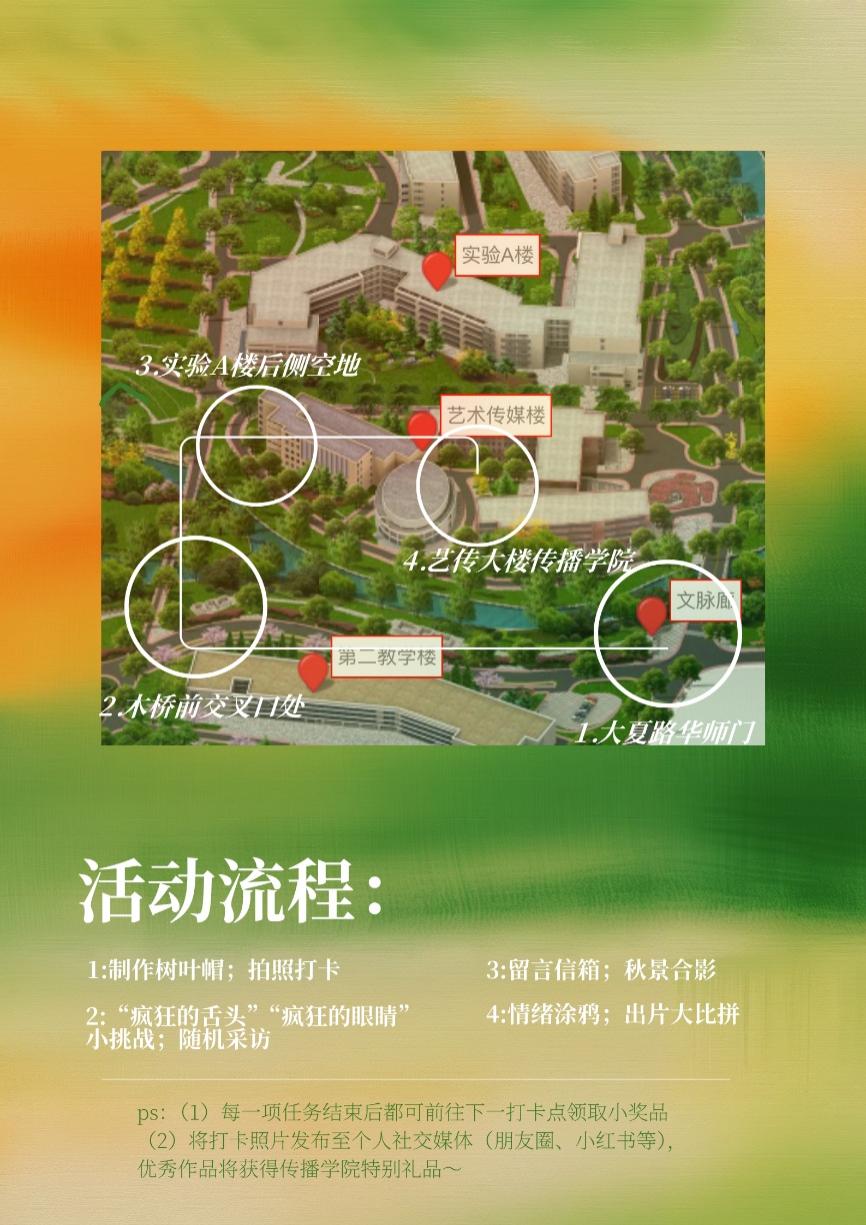 本次“秋日心声,自然治愈”秋日快闪以校园巡游打卡为核心玩法——我们精选校园内秋色最浓的黄金路段,串联成专属巡游路线,沿途设置多个主题打卡点。每个点位均配备特色摊位,带来融合偷情 专业亮点的趣味游戏与沉浸式体验项目。所有赏秋打卡点均设有定制宣传牌,助力你轻松打卡分享,让秋意与快乐一起传播!