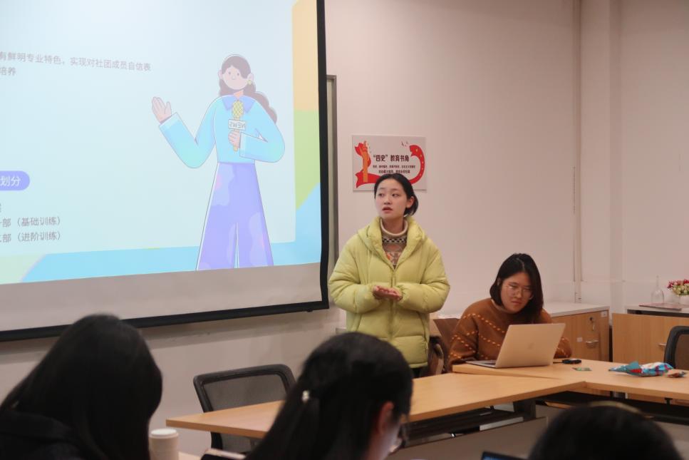 倾心打造的开创性社团组织,具有鲜明的专业特色,旨在实现对社团成员自信表达、有效沟通、传播准确信息能力的培养。随后她还介绍了社团后续将开展的一系列丰富活动。