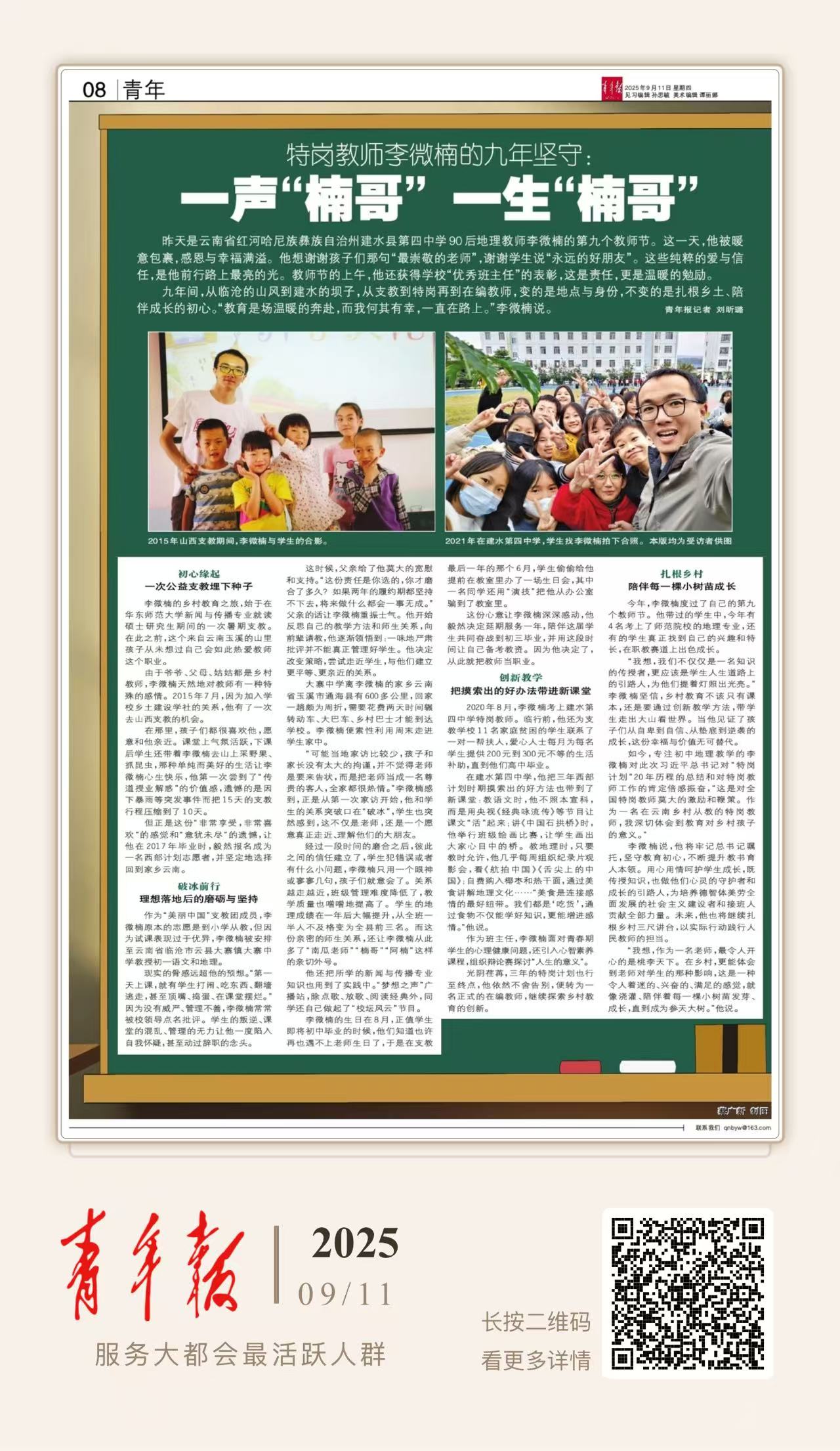 “我想,我们不仅仅是一名知识的传授者,更应该是学生人生道路上的引路人,为他们提着灯照出光亮。”李微楠坚信,乡村教育不该只有课本,还是要通过创新教学方法,带学生走出大山看世界。当他见证了孩子们从自卑到自信、从垫底到逆袭的成长,这份幸福与价值无可替代。