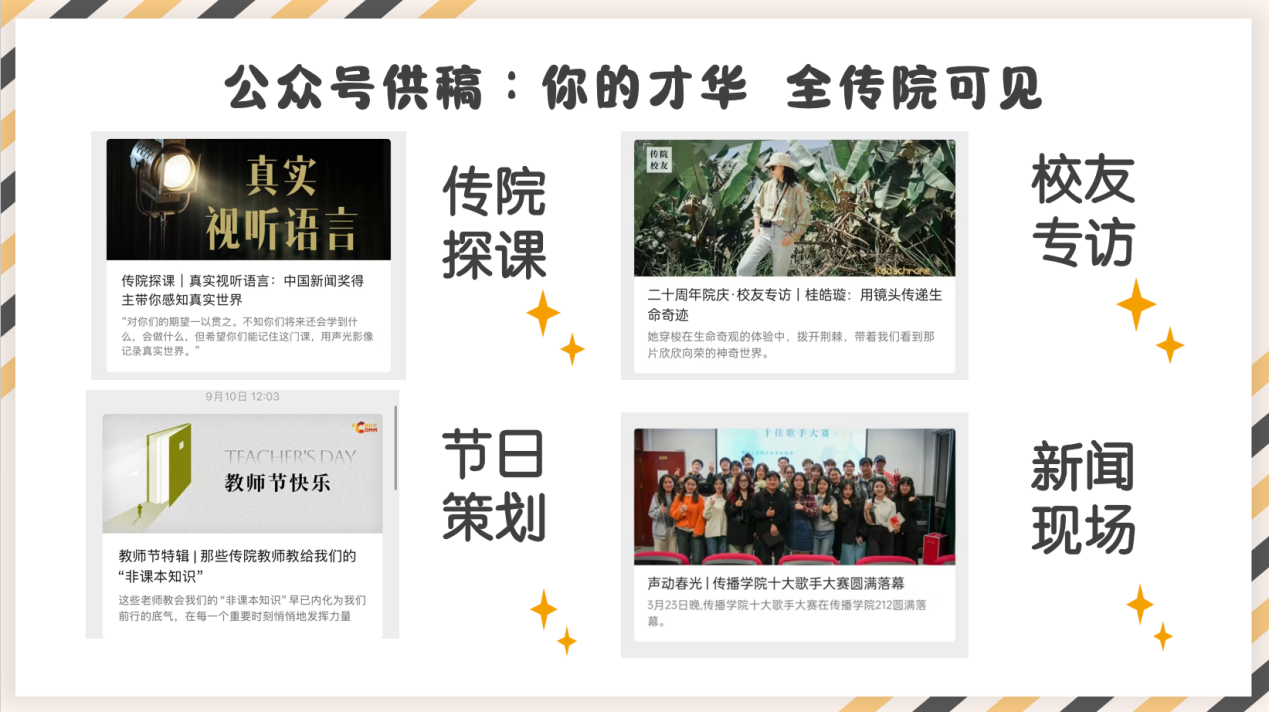 从传院教师到优秀校友,从特色课程到新闻现场,传院的精彩故事都能由你来讲述,在展现传院风采的同时,你也拥有了属于自己的代表作。